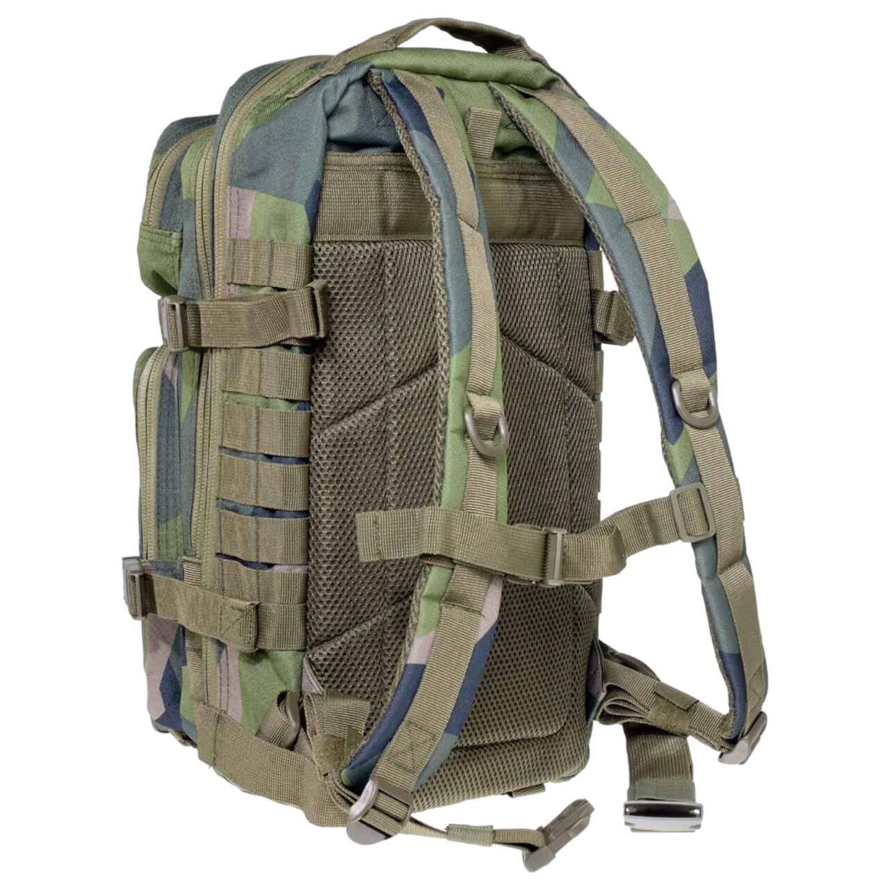 Hátizsák 2 nagy főrekesszel és 2 elülső, egyenként cipzáras rekesszel, tépőzáras zseb a hátoldalon a folyadékpótló rendszer számára. Hordozófogantyú, párnázott hát- és vállpántok D-gyűrűkkel, Molle rögzítési pontok, tépőzáras felület az első rekeszben.