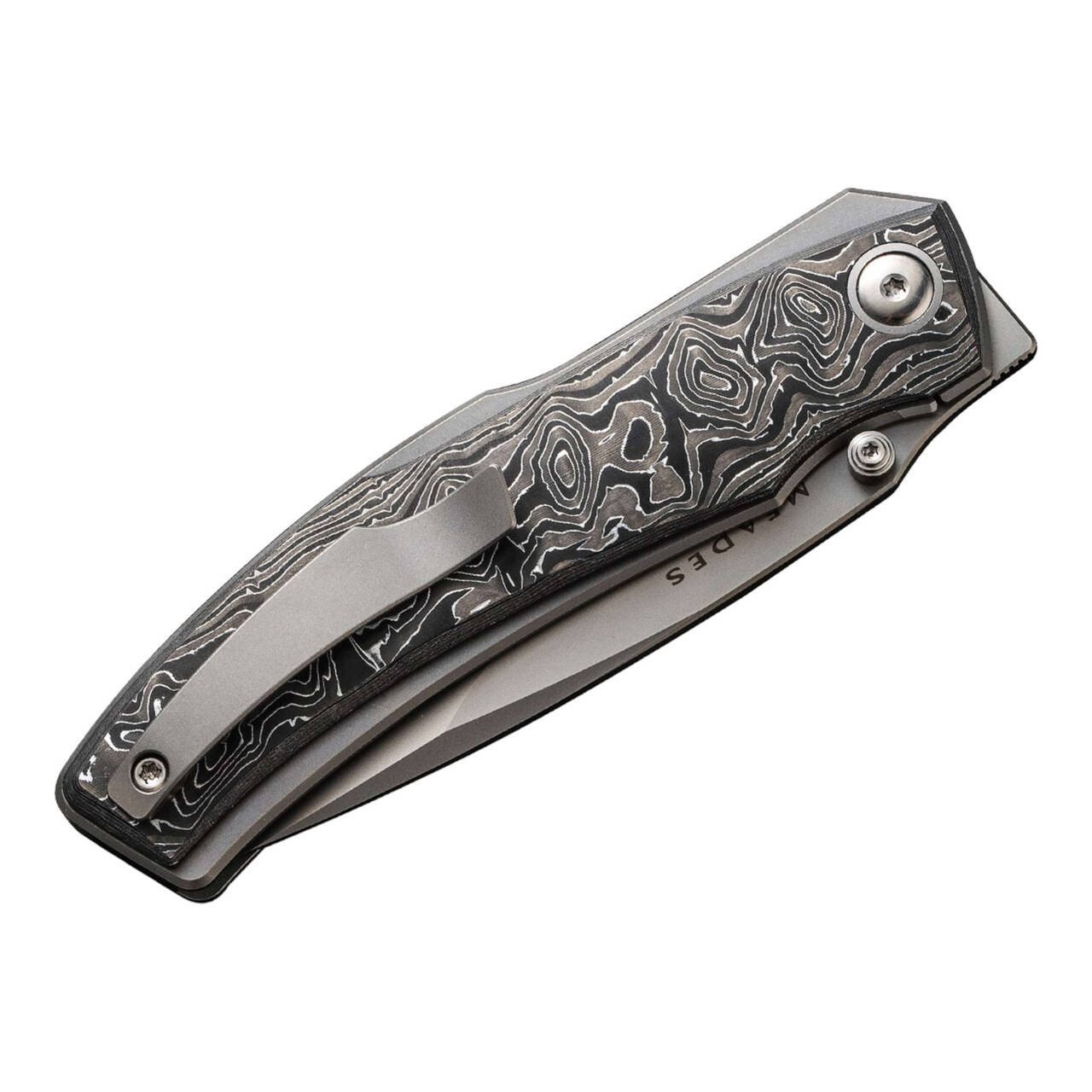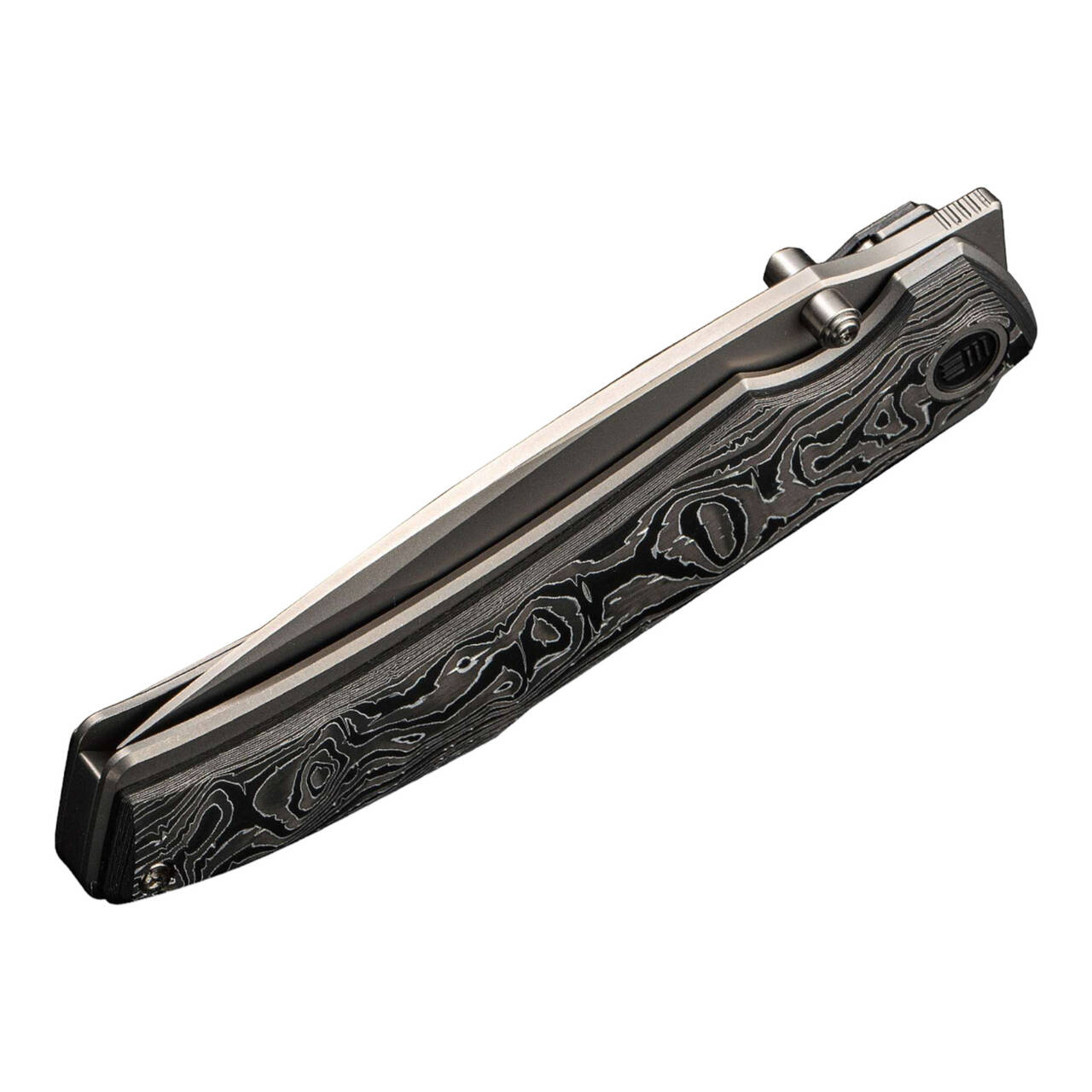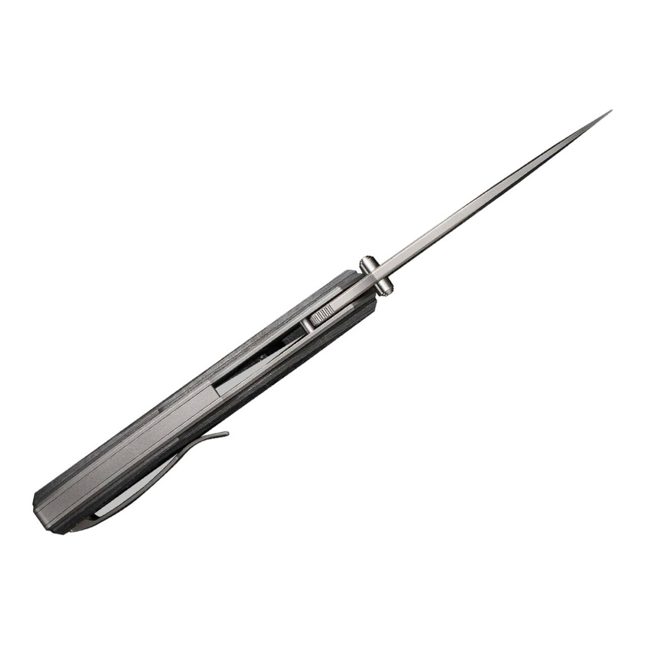 Modern vonalak és extravagáns design jellemzi a WE Knife Swordfin-t, mint kiváló minőségű EDC zsebkést. A porfémkohászati CPM-20CV anyagból készült golyóscsapágyazott tanto penge flipperrel vagy hüvelykujjas szegeccsel nyílik, míg a zárásról a kiváló bélészár gondoskodik. A titánium béléssel ellátott markolat alumíniumfóliázott karbon pikkelyekkel van ellátva. Tip-up klippel (r).