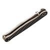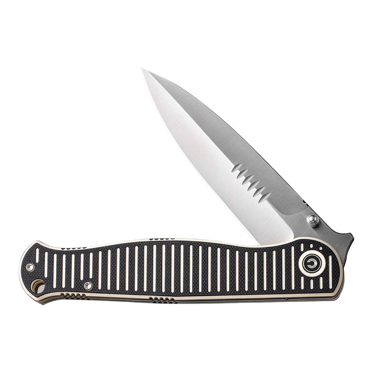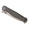 Dinamikus, közvetlen, RS71 - Robert Saniscalchi a CIVIVI-vel közösen fejlesztette ki ezt a dinamikus zsebkést, amely teljesen újradefiniálja a szimmetriát. Az egyélű, golyóscsapágyazott, Nitro-V anyagból készült lándzsás penge a hüvelykujjas csappal nyílik, és a robusztus bélészárral záródik. A vizuális csúcspont a fekete és krémfehér G10-ből készült maratott markolat, amely kiváló fogást, valamint csíkos megjelenést ígér. A barázdált mintázatot diszkréten és elegánsan veszi fel a penge. Lanyardlyukkal és tip-up klippel (r).