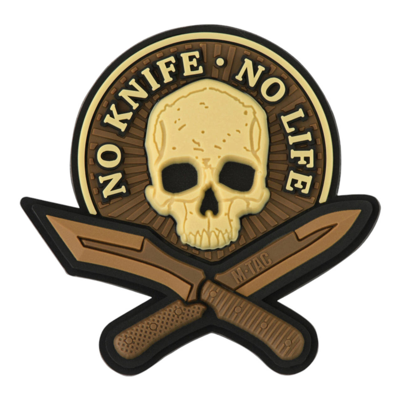 M-Tac No Knife - No Life 3D PVC tapasz. A kés nagyon veszélyes fegyver lehet egy profi kezében. A feladatoktól és az aktuális helyzettől függően a kés használható vívópárbajban, más típusú fegyverek elleni küzdelemben, az ellenség megölésére (speciális célú feladatok keretében), valamint dobásra. A fegyver formájától és az elfogás módjától függően a használat technikája némileg változik, bár az elv, a taktika és a mozgások dinamikája változatlan marad. Az M-Tac No Knife - No Life 3D Patch - az úgynevezett „morálfoltok” - az ujjra erősíthető tépőzáras hurokra (a tépőzáras kampó a folt hátuljára van varrva), vagy felszerelésre - hátizsákokra, sisakokra stb. Ezek nem kötelezőek, de a harctéren és azon kívül is viselhetők. Gyártási anyaga - gumi.