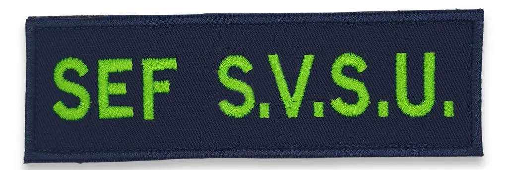 Az SVSU főnöki jelvénye 100% poliészter Madeira Polyneon fonalból készült, gyémántpiros színű, 65/35% pamut/poliészter anyagból készült, tengerészkék hátlapon, hővel lepecsételt betéttel.