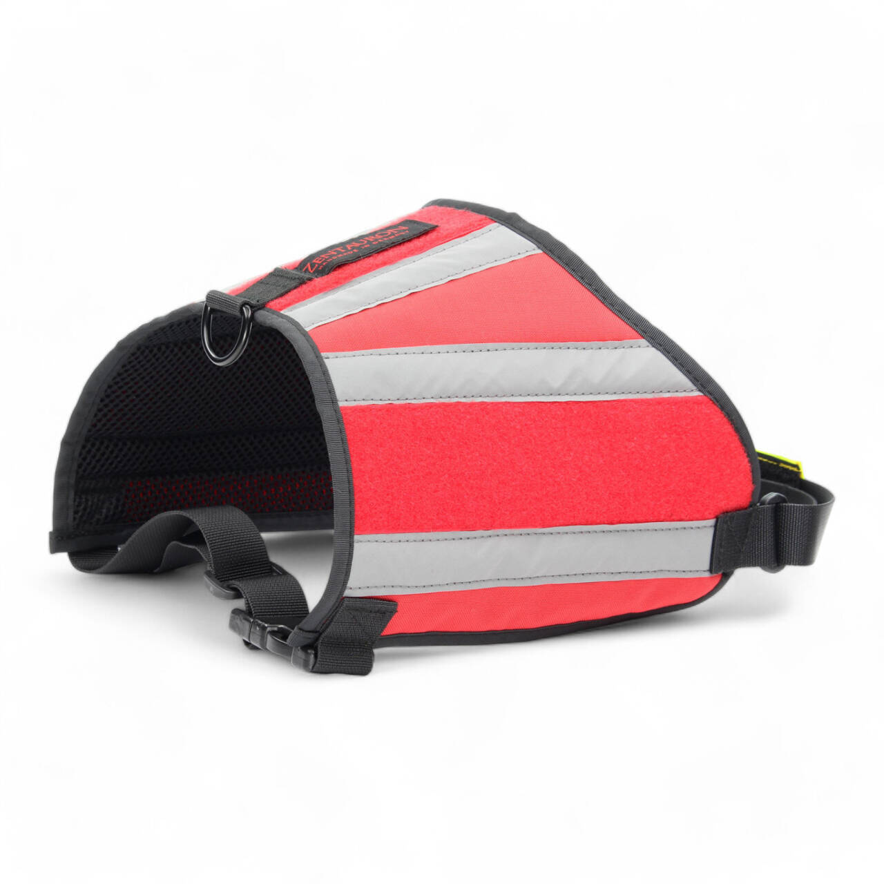 Láthatósági mellény kutyák számára kifejlesztett és gyártott hasonlóan szolgálati kutyák / mentőkutyák / családi kutyák számára. Bárhol, ahol az ember legjobb barátjának láthatónak kell lennie, ez a mellény hasznos. A mellény alaptestét robusztus Cordura® anyagból készítik, amelyet 3D kötött távolsági textilszövettel béleltek ki, így sem hőség, sem folyamatos nedvesség nem keletkezik az állat testén. Ráadásul ezek a szövetek könnyűek és kellemes viseletet biztosítanak. Mindkét oldalán és a felső részén egy 50 mm széles fleece-velcro csík található, amelyre kiegészítők, tapaszok, feliratok vagy LED-ek rögzíthetők. A 6 fényvisszaverő csík nagyon jó láthatóságot biztosít a sötétben. Az állítható mellszíjon egy másik mozgatható fényvisszaverő csík található, így a kutya szemből is látható. A derékszíj állítható csattal záródik, így a mellény felvehető és levehető. gyorsan és egyszerűen. A rozsdamentes acél D-gyűrű póráz, zseblámpa vagy csengő rögzítésére szolgál.