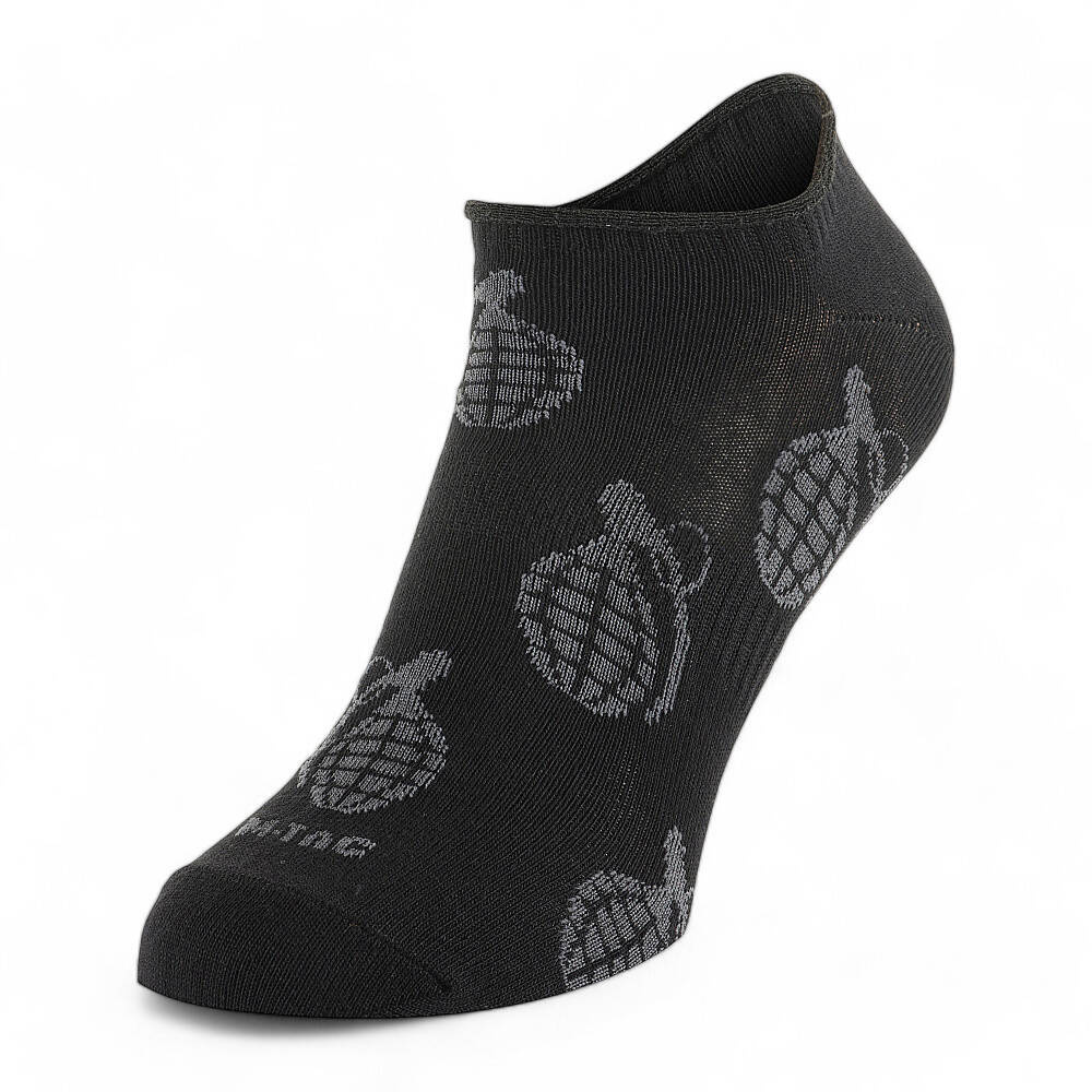 Könnyű, légáteresztő anyagból készült: 85% pamut, 10% poliészter, 5% elasztán. Ez a textilösszetétel optimális hőszabályozást biztosít, ennek eredményeként a zokni nem izzad. Rövidített kialakításúak, ergonomikusan elhelyezett nyomáspontokkal, amelyek optimális illeszkedést biztosítanak a lábon, és szinte láthatatlanok a cipőben. A gránátvörös mintázat eredeti megjelenést kölcsönöz a zokninak, az anatómiai forma pedig kényelmes viseletet biztosít a cipőben.