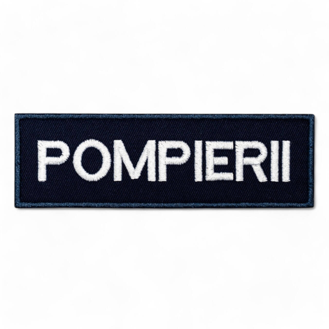 Emblema "POMPIERII" brodata are conturul exterior realizat cu fir albastru indigo Madeira Polyneon 100% poliester. Suportul este navy confectionat din tercot termocolat.