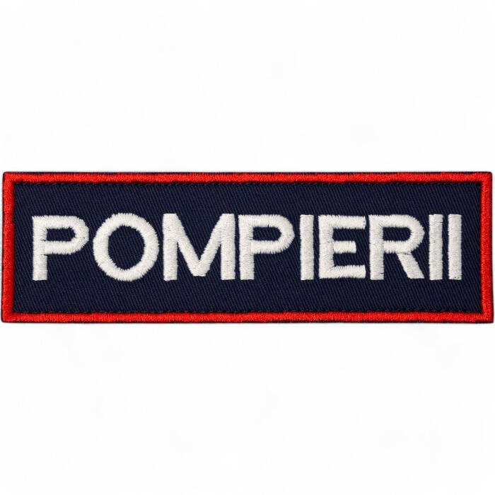 Emblema "POMPIERII" brodata are conturul exterior realizat cu fir albastru indigo Madeira Polyneon 100% poliester. Suportul este navy confectionat din tercot termocolat.