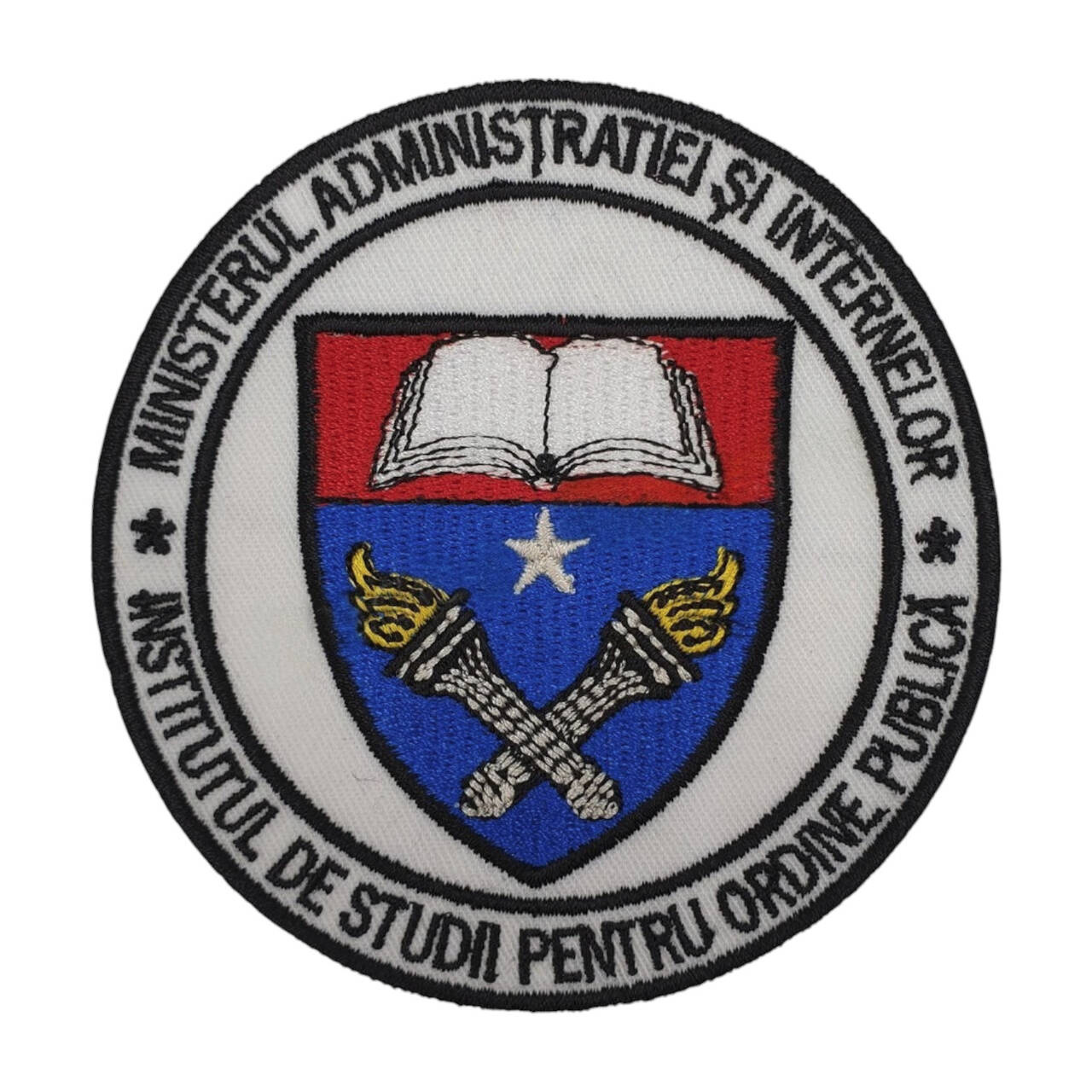 Emblema Institutul de Studii pentru Ordine Publica brodata cu fir Madeira Polyneon - 100% polyester pe suport din material 65/35% bumbac/poliester de culoare alba cu intaritura termocolanta. Se poate aplica atat prin coasere cat si cu arici, scai, velcro sau prin proceduri termice. Atunci cand alegeti varianta cu aplicare prin coasere ecusonul are un intaritor aplicat pe partea din spate pentru a se obtine protectia cusaturilor.
