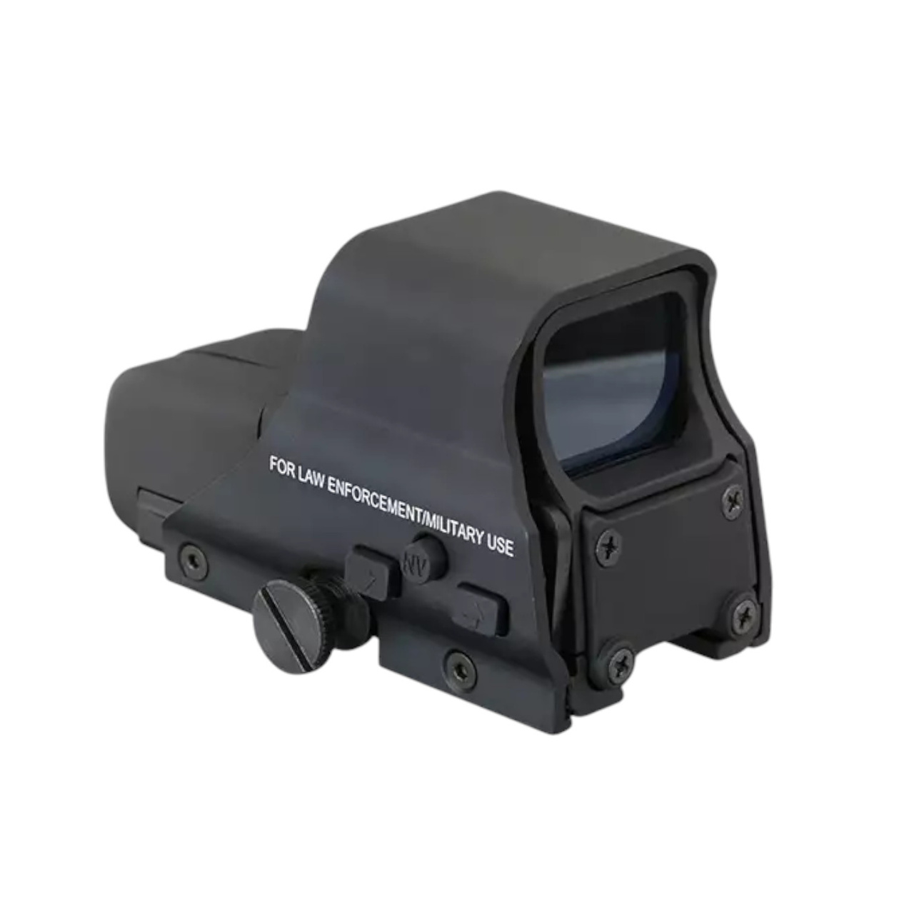 A HWS másolata, a legjobb két nyitott szemmel való lövéshez, és amikor gyorsaságra és pontosságra van szükséged. Biztosítja a gyorsabb célmeghatározást, és nagyobb területi kontrollt biztosít a kezelőnek. Minden szabványos Picatinny sínhez illeszkedik. Megvilágítási típusok: piros és zöld. 4 db LR44 elemmel működik.