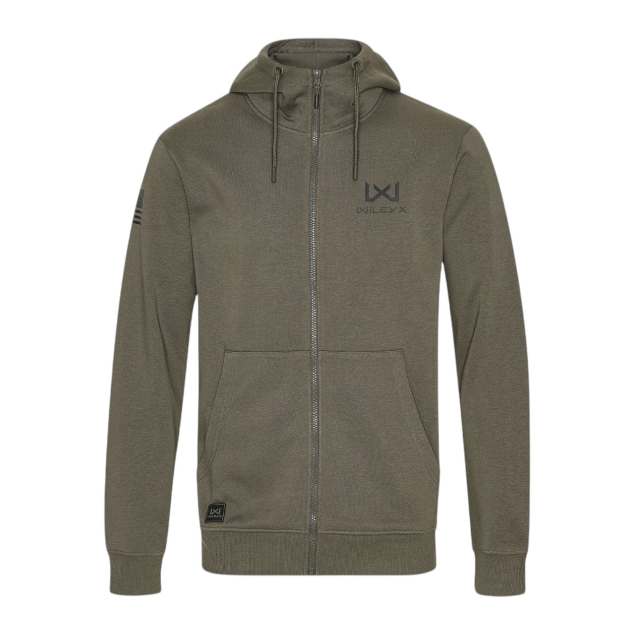 A kapucnis pulóver 70% pamutból és 30% poliészterből készült, ami kellemes, puha minőséget biztosít viselőjének, amely egész nap kényelmes lesz. Cipzárral rendelkezik, így nyitottan vagy zártan is viselheted, attól függően, hogy mit szeretnél. A bal mellkason egy kis kontrasztos WX/Wiley X logóval, a kenguru zseb alján pedig egy WX gumifolt található. A kapucnis pulóver jobb ujján egy amerikai támadó zászlót ábrázoló nyomat található, ami azt jelenti, hogy a zászló csillagai előrefelé néznek, illusztrálva a zászló mozgását, ahogyan az amerikai egyenruhákon látható.