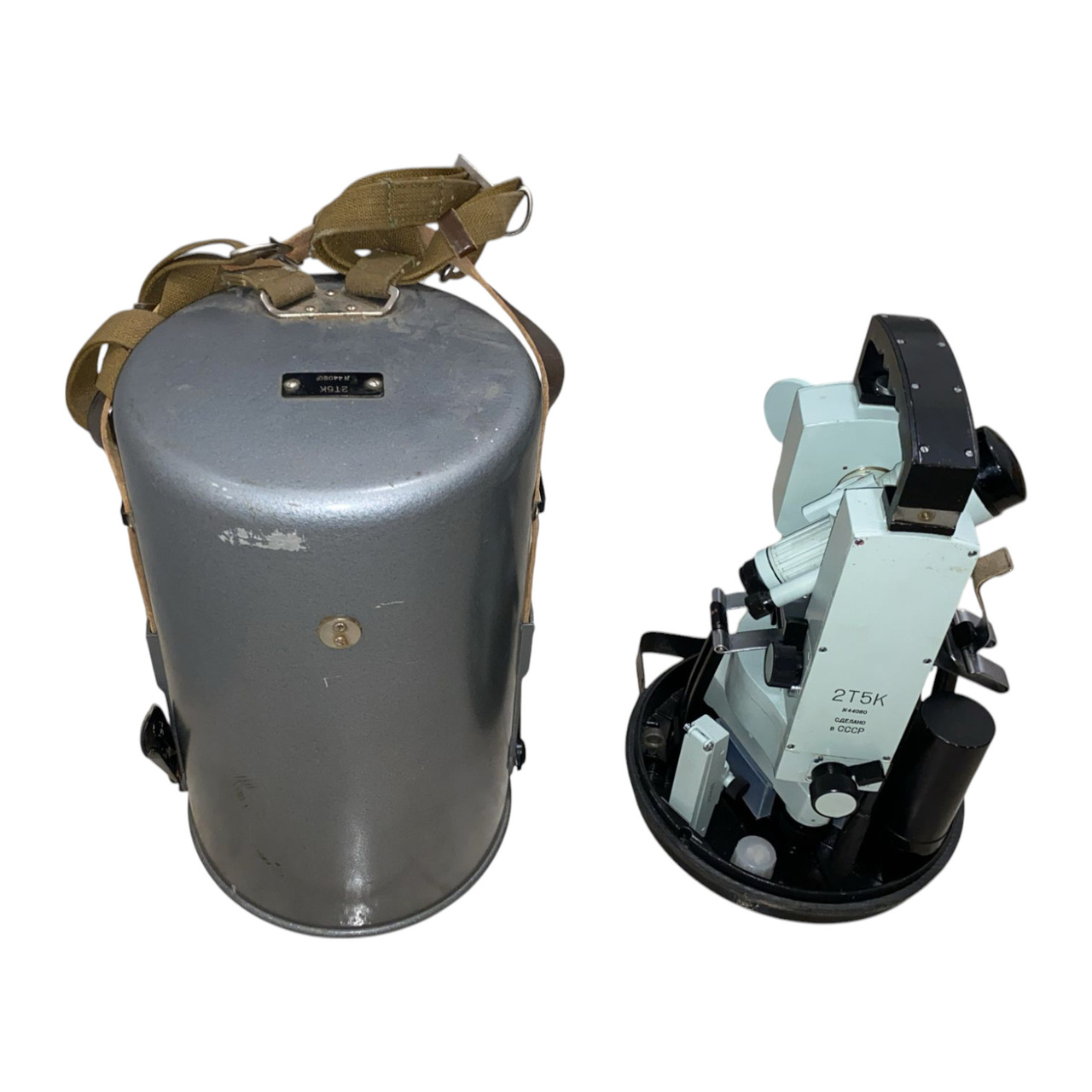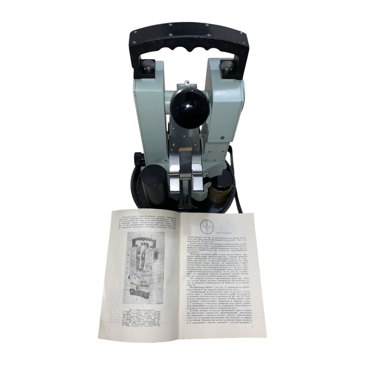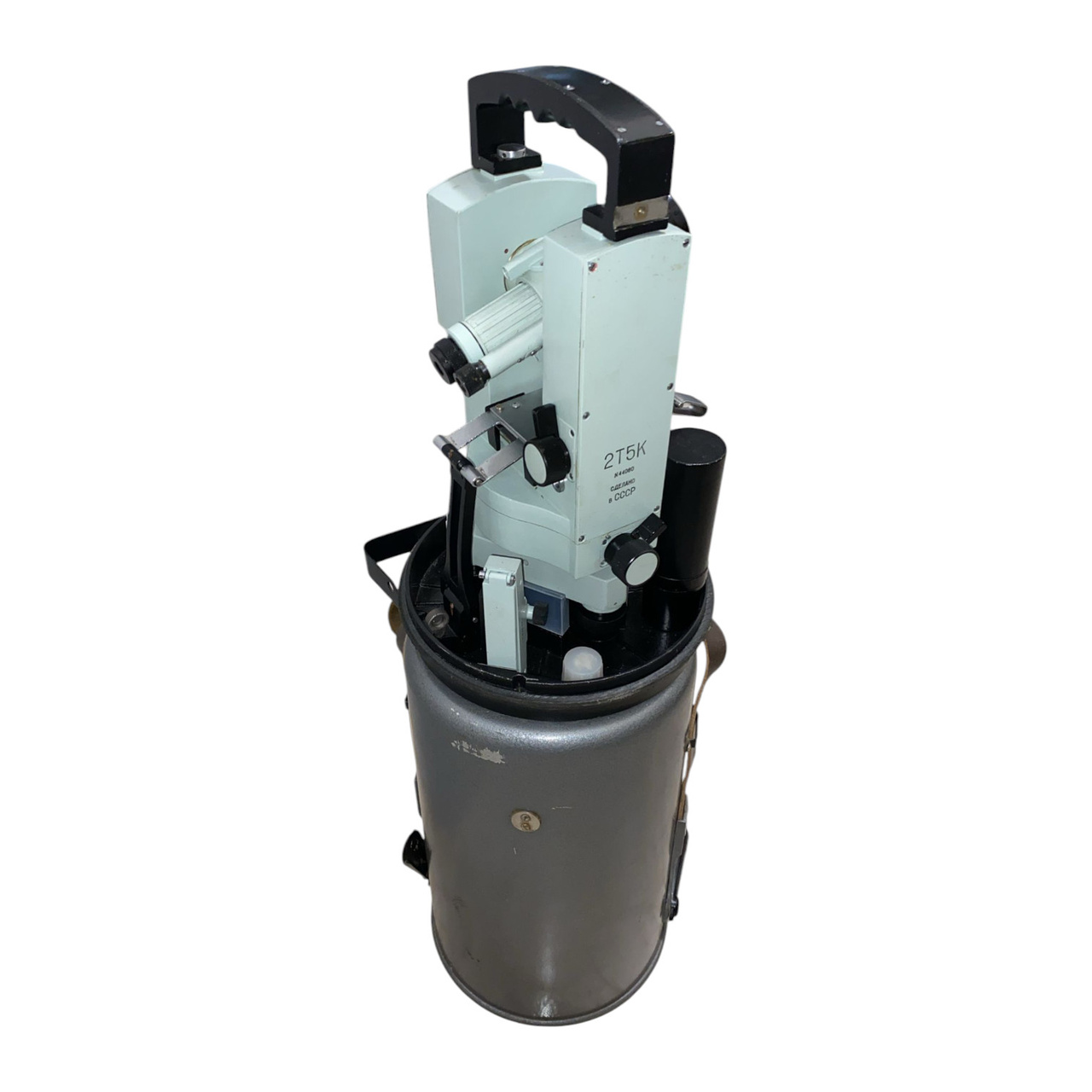 Theodolit, amelyet a Szovjetunióban gyártottak az 1970-1980-as időszakban, 2T5K modell. Abban az időben Romániában is széles körben használták. A képeken látható állapotban, a használt darab, teljesnek tűnik, kivéve a dobozban lévő karbantartó és beállító szerszámokat, ahol úgy tűnik, hogy kis hézagok vannak a vonalukban, és egy hibás zsanér az egyik oldalsó patenton ( lásd fotó ). A működőképességét és a kalibrálás módját nem teszteltem, mivel nem rendelkezem a szükséges ismeretekkel.