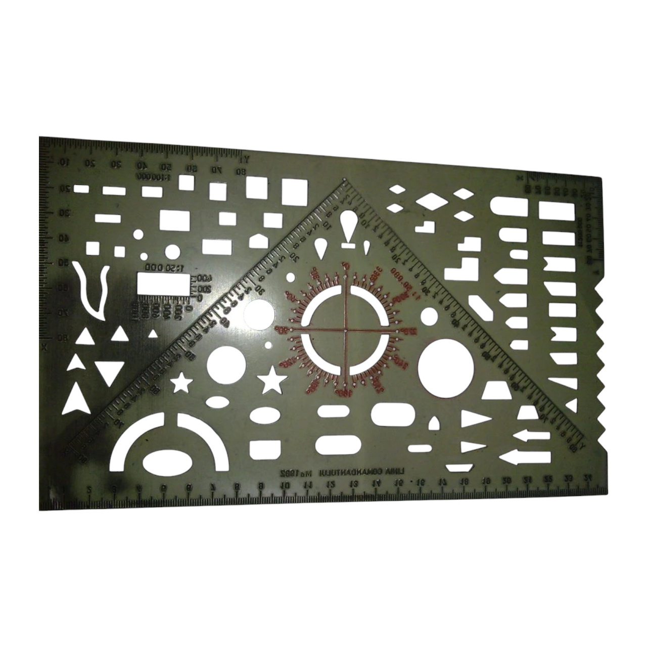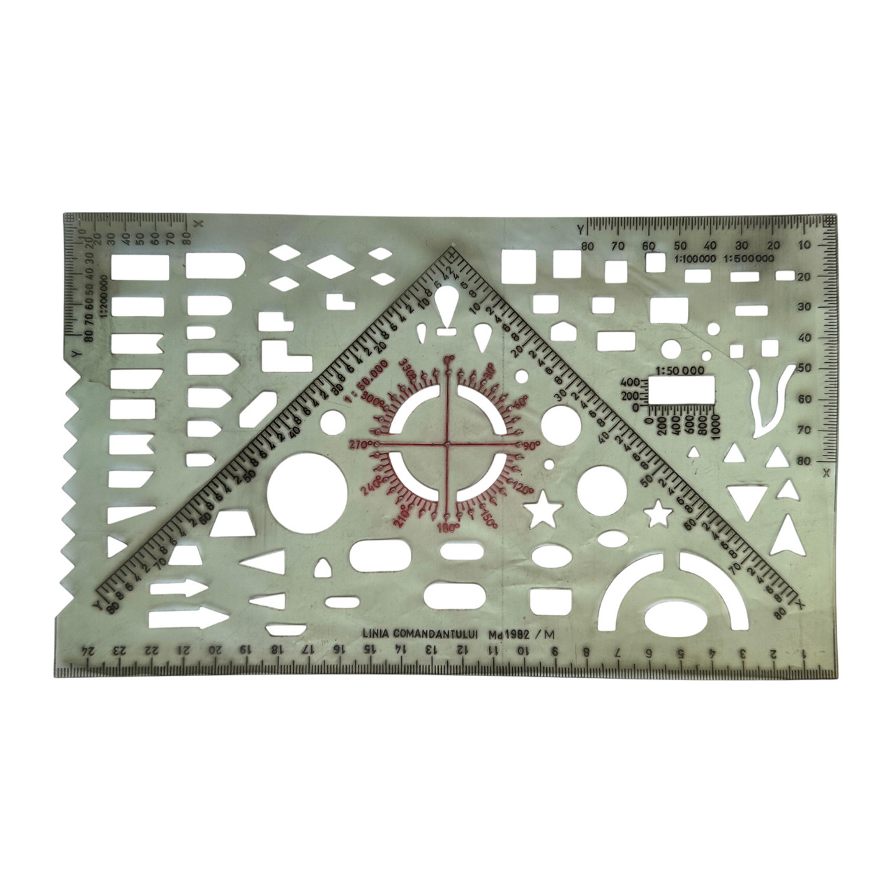 Ez a vonalzó egy összetett eszköz, szabványosított geometriai formákkal és hasznos skálákkal, többek között: