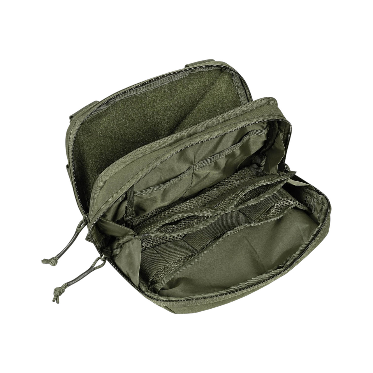 Első rész – cipzáras zseb, tépőzáras rekesz és MOLLE hurkok kiegészítők rögzítéséhez.