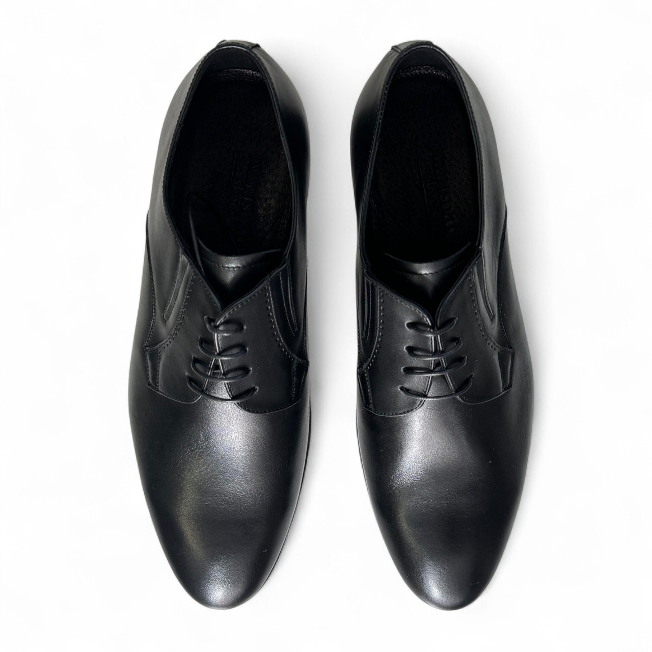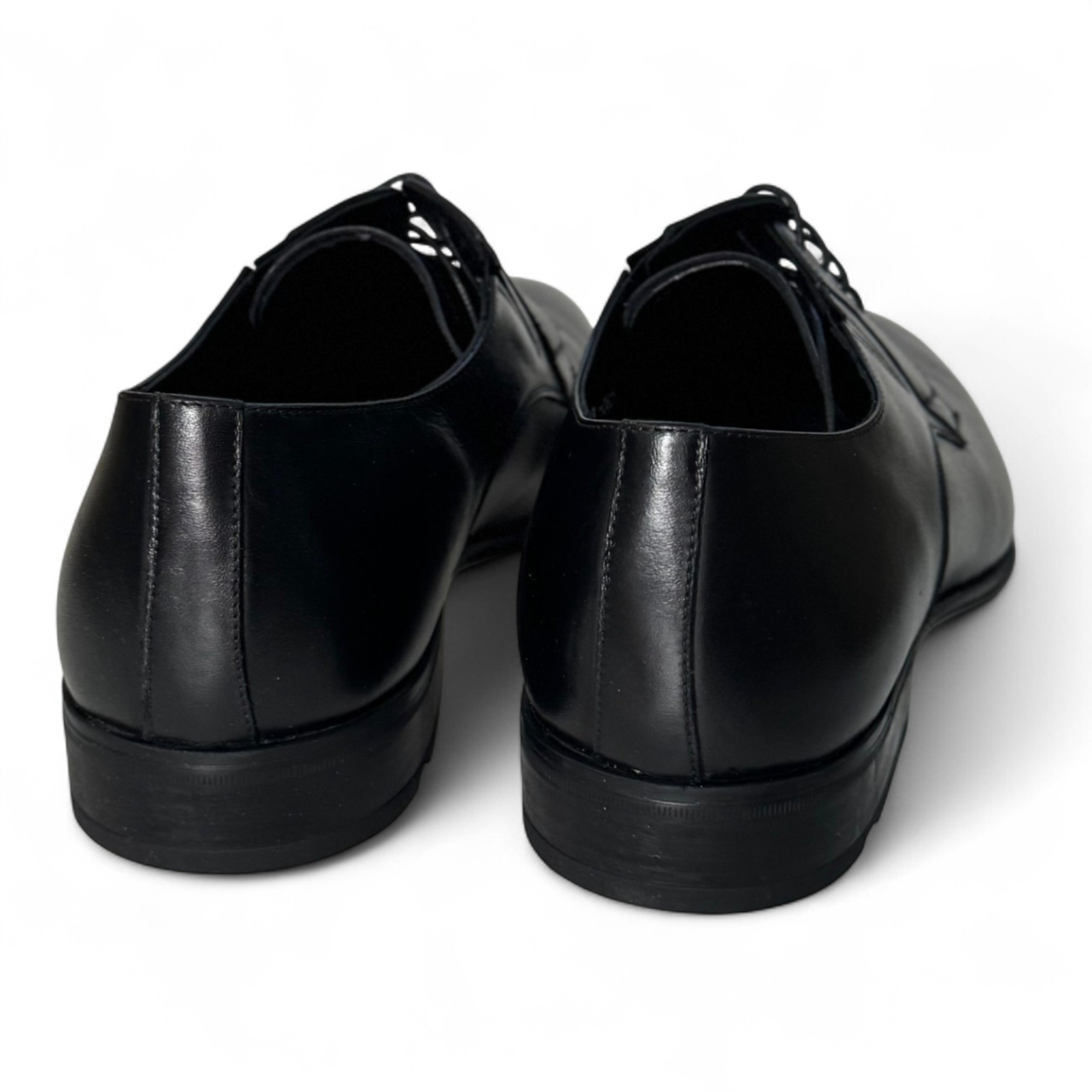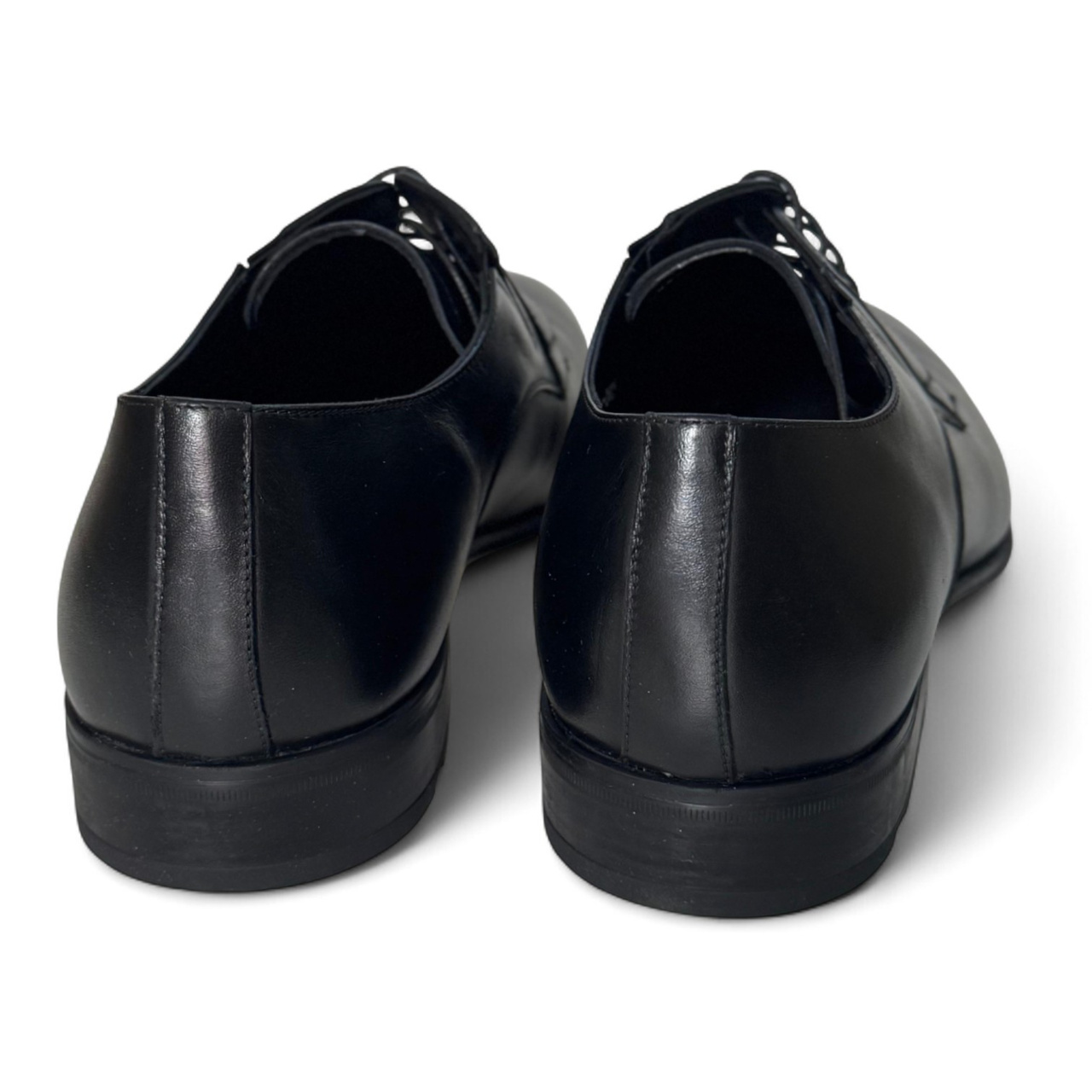 Klasszikus fazonú cipő, természetes fekete Vitello bőrből készítve, iskolai vagy munkahelyi mindennapos viseletre tervezve. Masszív modell elegáns kidolgozással és erős szerkezettel, egyenruhához is ideális.