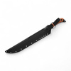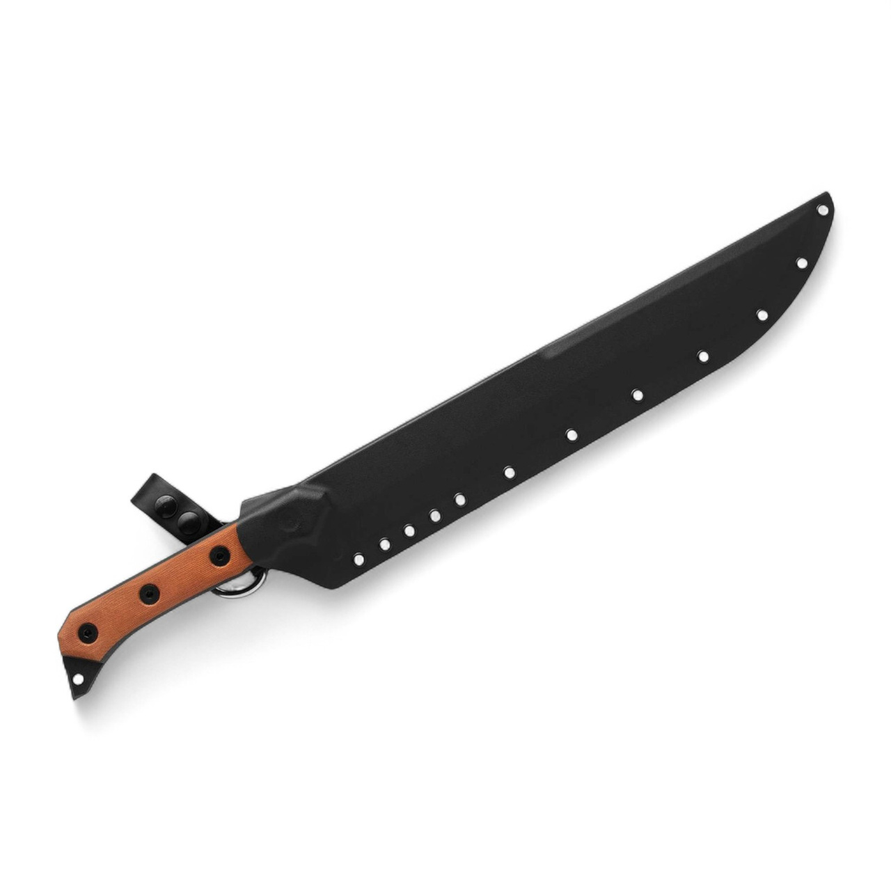 A két rétegű vászonmicarta markolatlapok, fekete és barna színkombinációban, a robusztus teljes tanghoz négy hatszögletű csavarral vannak rögzítve. A machete teljes funkcionalitását a pontosan illeszkedő Kydex-hüvely biztosítja, amelyhez dangler is tartozik.