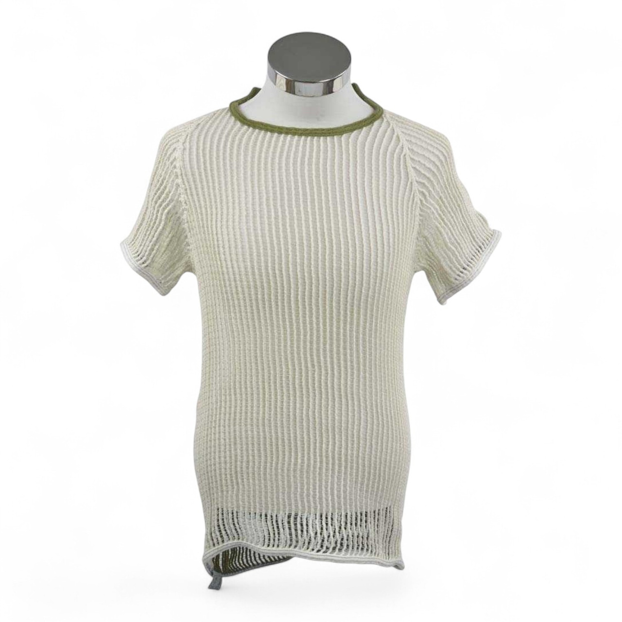Ez a dán hadsereg számára gyártott hálós póló, amely 1985-ben készült, igazi statement darab az törtfehér, olívazöld és kék díszítővarrások kombinációjának köszönhetően. A kialakítás erősebb függőleges szálakat és könnyebb, mozgást adó vízszintes hálós fonalat használ, ami a jellegzetes hálós textúrát hozza létre. Viselhető lezseren, bő hatást keltve, vagy a test vonalát követve egy nőiesebb sziluettért.
