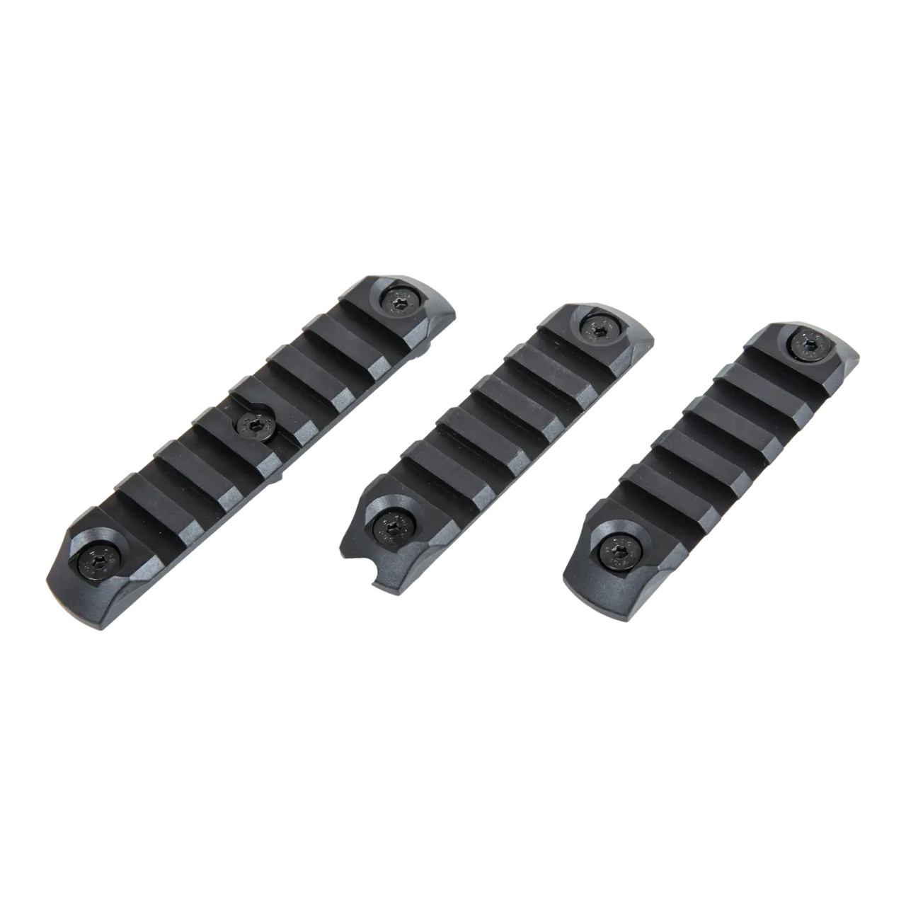 A készlet három műanyag RIS sínt tartalmaz, 7,5 cm és 9,5 cm hosszúságúak, M-LOK rendszerekre való felszerelésre tervezve.