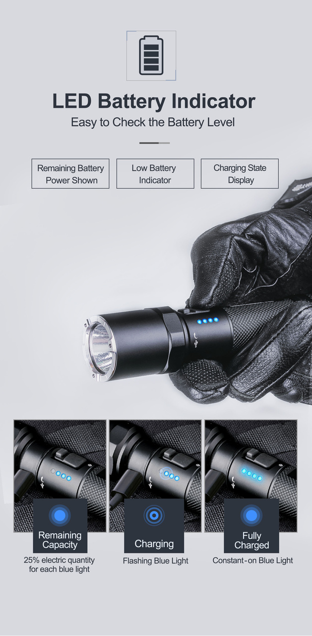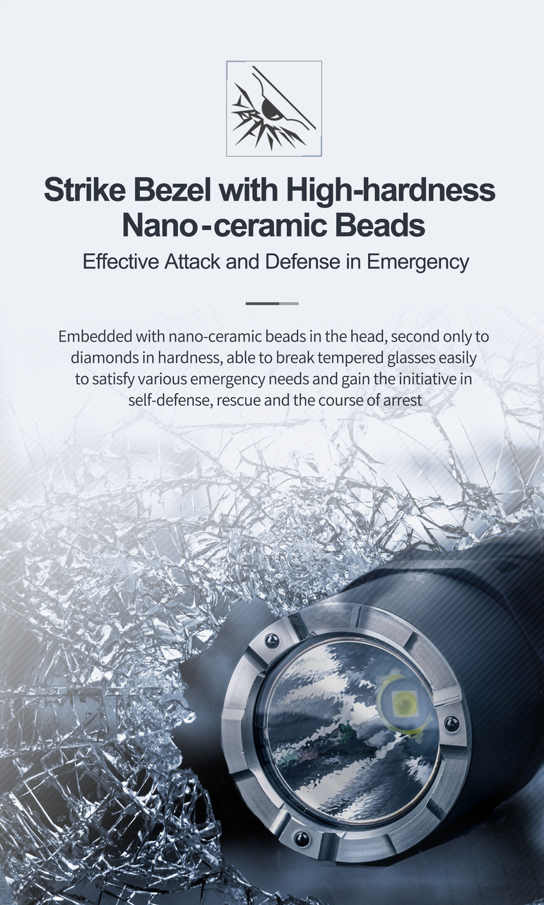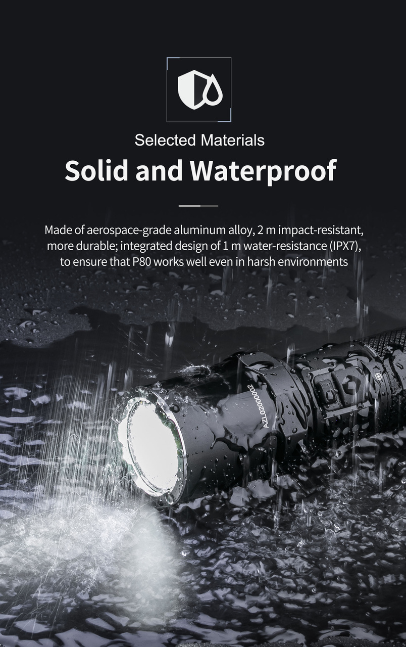A 6061-T6 repülőgépipari alumíniumból készült ház és a III. típusú kemény eloxálás kiváló tartósságot és magas kopásállóságot garantál. A lámpa akár 2 méteres ütésállósággal és IPX7 vízállósági besorolással rendelkezik.